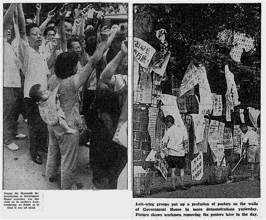 “Groups of demonstrators returning from Government House mobbed round Statue Square and the Law Courts and resorted to violence and rowdiness by molesting spectators and by attempting to block the tramlines with rubbish.