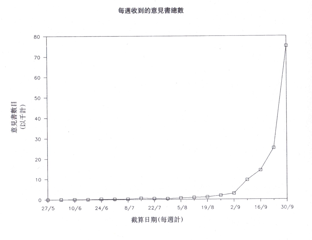 「(甲)盡量邀請廣大市民對「1987年代議政制發展檢討」綠皮書內所討論各問題作出反應,並收取和記錄所有在1987年9月30日或之前以書面發表的意見,包括直接向該處提交的、或間接經由現存各諮詢途徑向該處提交的意見書;和
